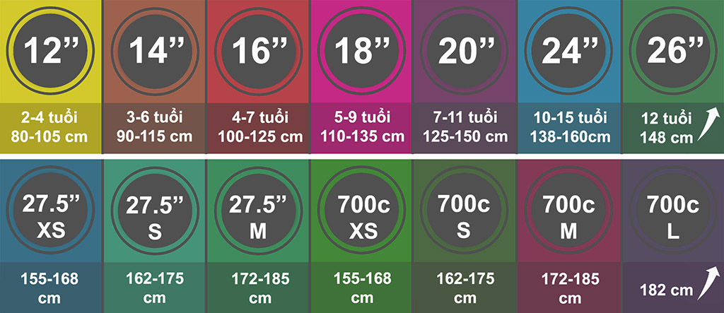 Có tương đối nhiều kích thước xe, và các thông số có thể sẽ khiến bạn cảm thấy mơ hồ. Về cơ bản, kích thước xe thường gồm 2 thông số đại diện (1) kích thước vành bánh xe: 26"/27.5"/.. và (2) kích thước khung xe: XS/S/M/L