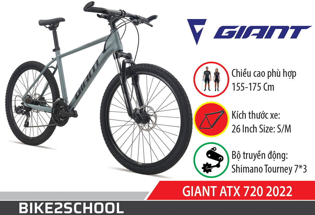 Giant ATX 720 2022 được trang bị bộ truyền động Shimano Tourney 7x3S giúp xe có được tốc độ tốt, và thích ứng trên nhiều dạng địa hình khác nhau. Thừa hưởng bộ khung hợp kim Nhôm Aluxx độc quyền của Giant, ATX 720 là lựa chọn tốt trong phân khúc xe cao cấp hơn 10 triệu đồng.