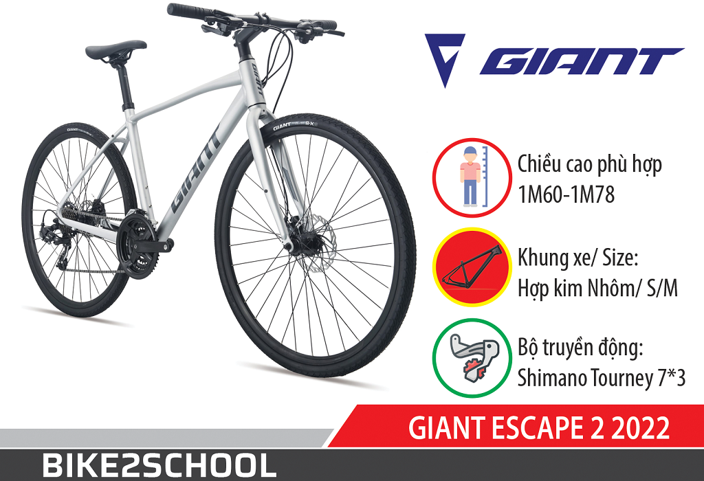 Giant Escape 2 2022 là dòng xe đạp Touring/City với đặc điểm điển hình là bánh 700c, lốp khổ hẹp và không có phuộc giảm xóc. Xe phù hợp với các địa hình bằng phẳng, điển hình như đường phố đô thị, với bánh 700c và tỉ số truyền cao xe cho phép tăng tốc nhanh và tốc độ tương đối tốt.