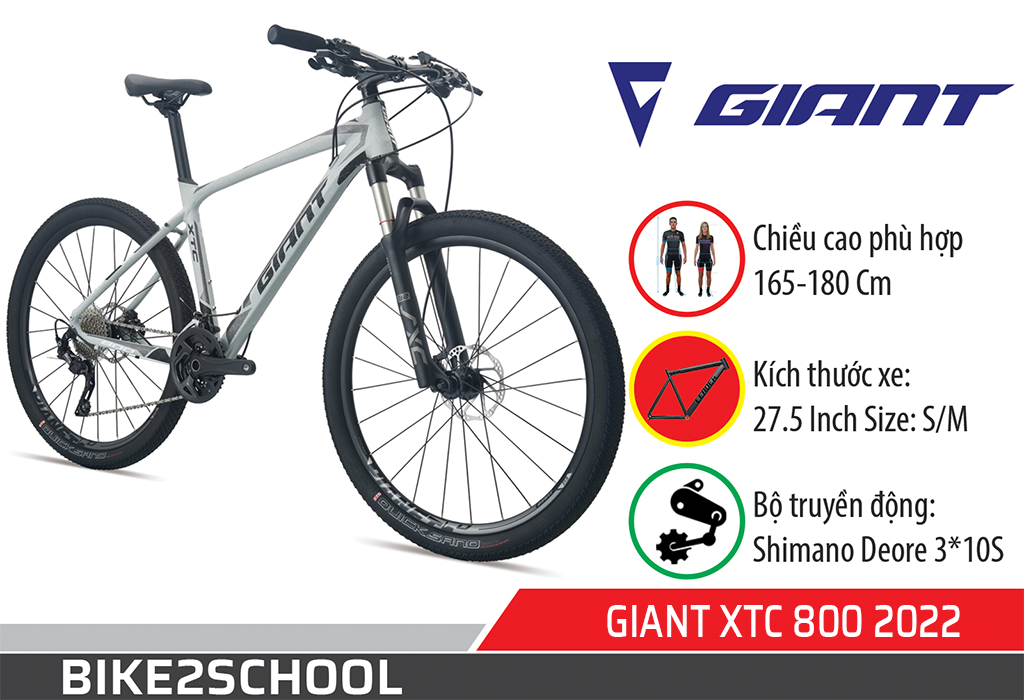 Giant XTC800 2022 là mẫu xe đạp địa hình thuộc phân khúc cao cấp, xe phù hợp với hầu hết các loại đường xá và địa hình khác nhau như đường phố, đường dốc, hay địa hình kém bằng phẳng. Xe được trang bị hàng loạt phụ tùng cao cấp: phanh dầu thủy lực, bộ truyền động Shimano Deore 3*10S, lốp chống mài mòn,..