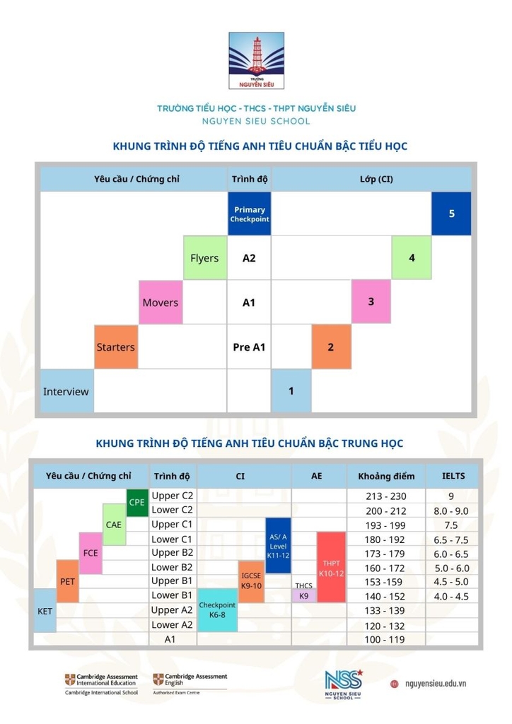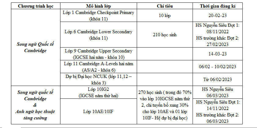 Trường Tiểu học, THCS và THPT Nguyễn Siêu tuyển sinh các lớp năm học 2023 - 2024 như sau: