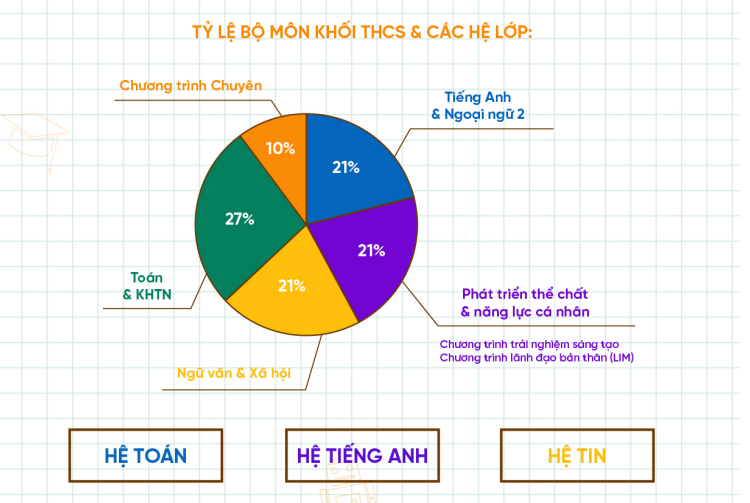 Học sinh khối THCS được lựa chọn 1 trong 3 hệ lớp: Chuyên Toán, Chuyên Anh và Chuyên Tin theo năng lực và nguyện vọng. Chương trình học thiết kế và phân bổ đều theo tỷ lệ như sau: