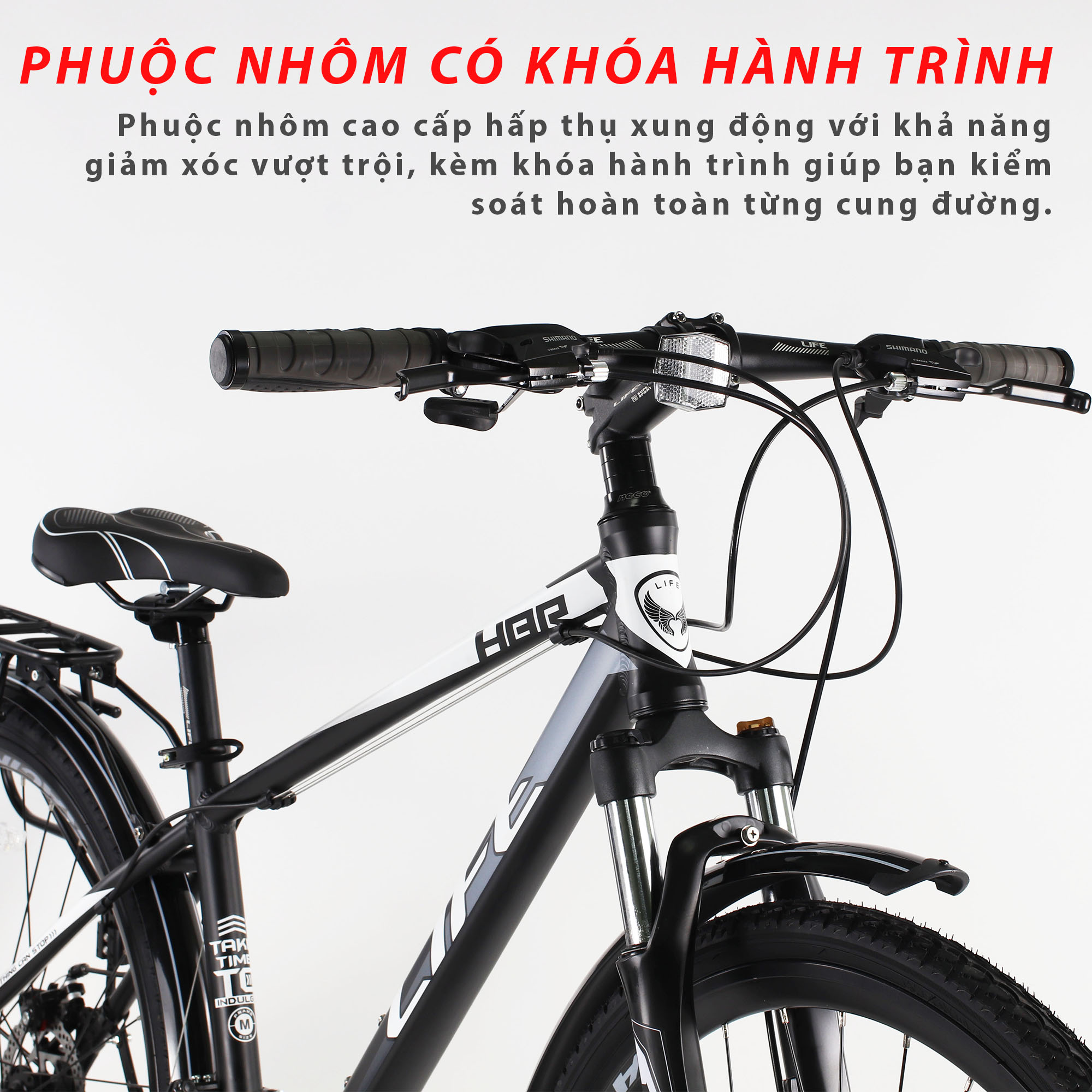 Dòng xe đạp địa hình Life này được trang bị cặp phuộc trước có khóa hành trình được làm từ hợp kim nhôm cao cấp, hỗ trợ xe giảm tình trạng xóc nảy khi đi qua những đoạn đường gồ ghề, sỏi đá không bằng phẳng, đem đến sự êm ái, nhẹ nhàng và sự kiểm soát hoàn toàn cho người đạp trên mọi cung đường.